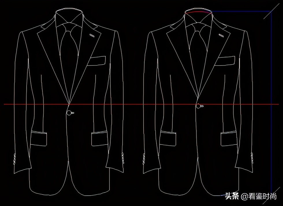 腰部纽扣的位置很关键,因为它将使眼睛沿着身体向上吸引。如上图所示,选择带有高腰纽扣的西装,这样可以将眼睛吸引到身体上方,并延长腿的比例。