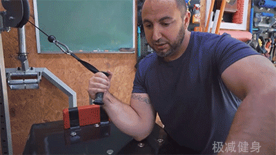 动作七,完整的掰手腕训练。值得一提的是,正确的掰手腕动作是将整个身体连同手臂一起往下压,而并非只是旋转前臂。另外,这个动作还可以将把手的位置上下调换,训练效果会非常不错。